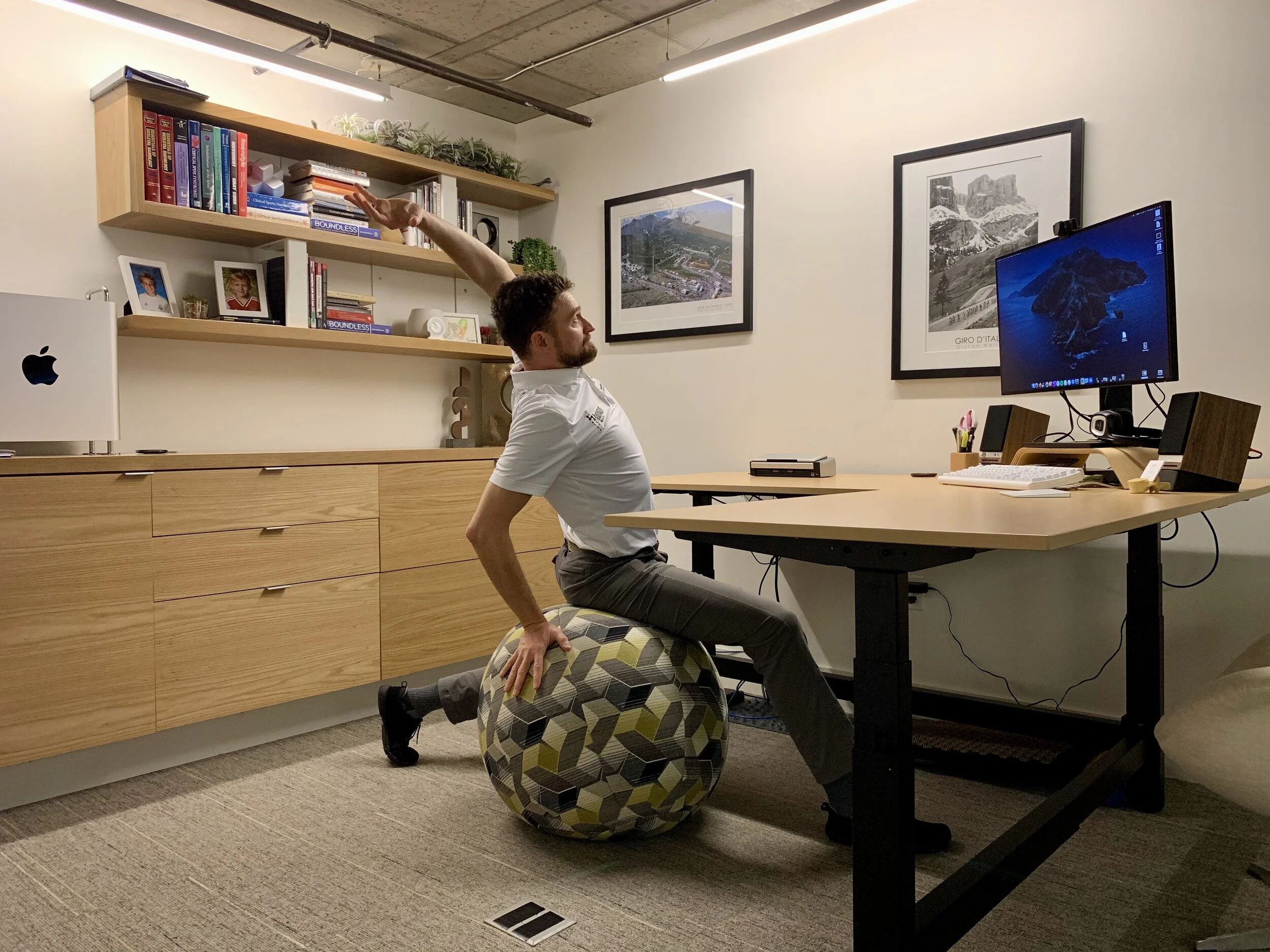 At the clinic, I have a full rehab space. I’ll take a full fifteen minute break and do a stretching sequence. Three times a week on treatment days, I sit at a desk for a half hour but then I’m on my feet and moving for the next six to seven hours. I do all my notes for 45 minutes, ride my bike to work and back, then have time for exercise stuff and family stuff when I get home.